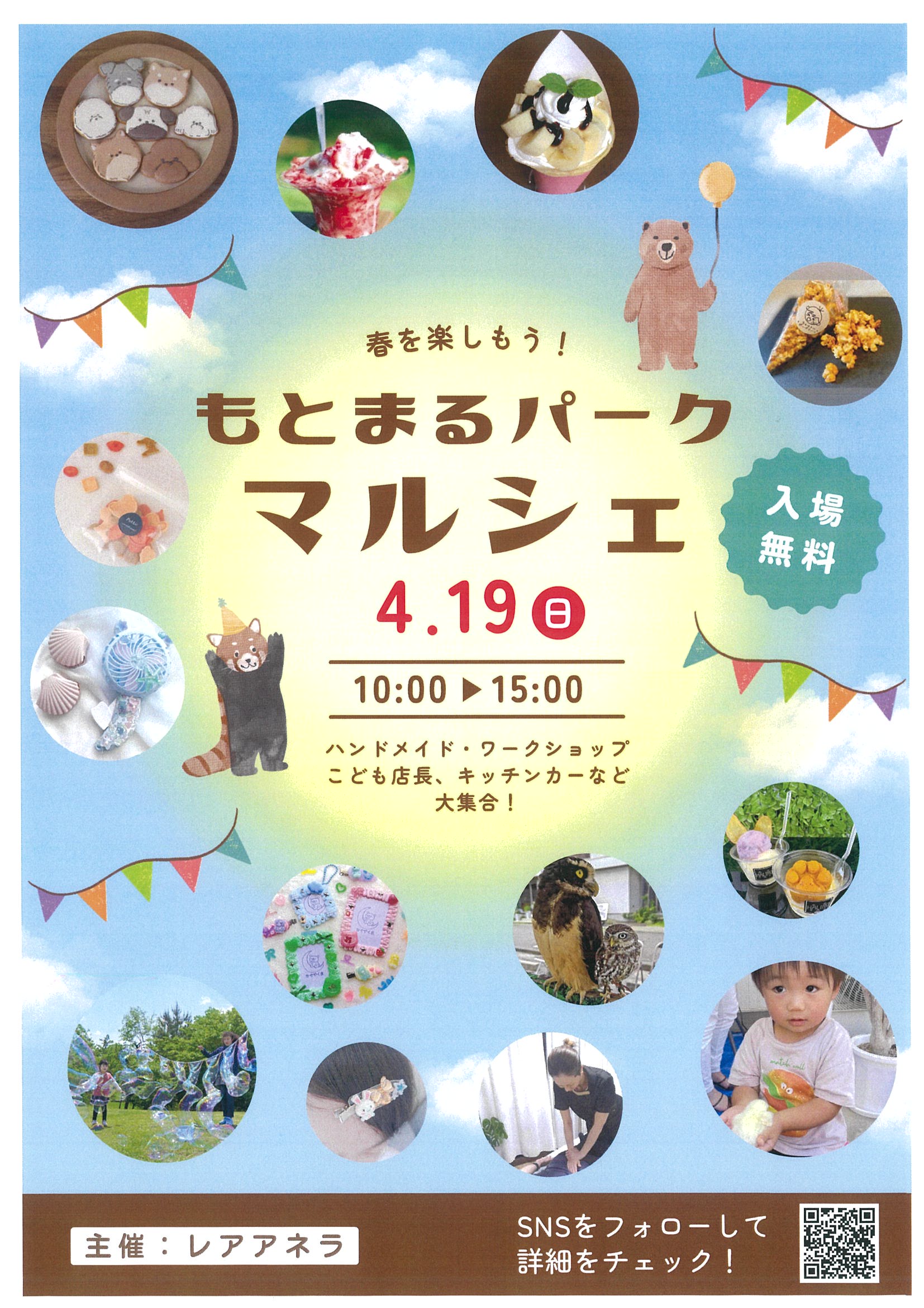 (4/19)もとまるパークマルシェを開催! 2026/4/14 イベント ①4月19日(日)10:00~15:00 もとまるパークマルシェを開催します! 主催:レアアネラ ワークショップや、雑貨販売、体験コーナーなど盛りだくさん!! キッチンカーもやってくるから、美味しいものもいっぱい食べちゃおう 暖かく過ごしやすくなってきたこの季節に、ぜひ遊びに来てね~ 雨天の場合は中止となります。